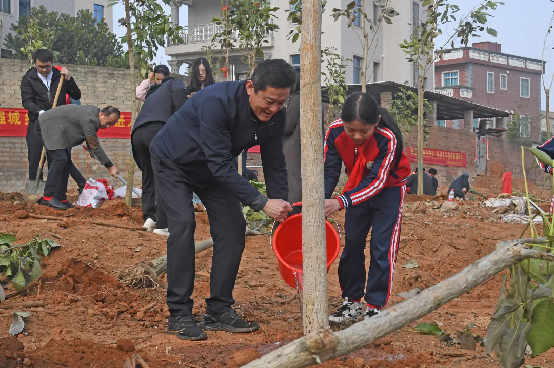 参与植树的干部群众分工协作、配合默契,扶正树苗、挥锹铲土、培土围堰、提桶浇水,合力种下风铃木、白玉兰、香樟等苗木。