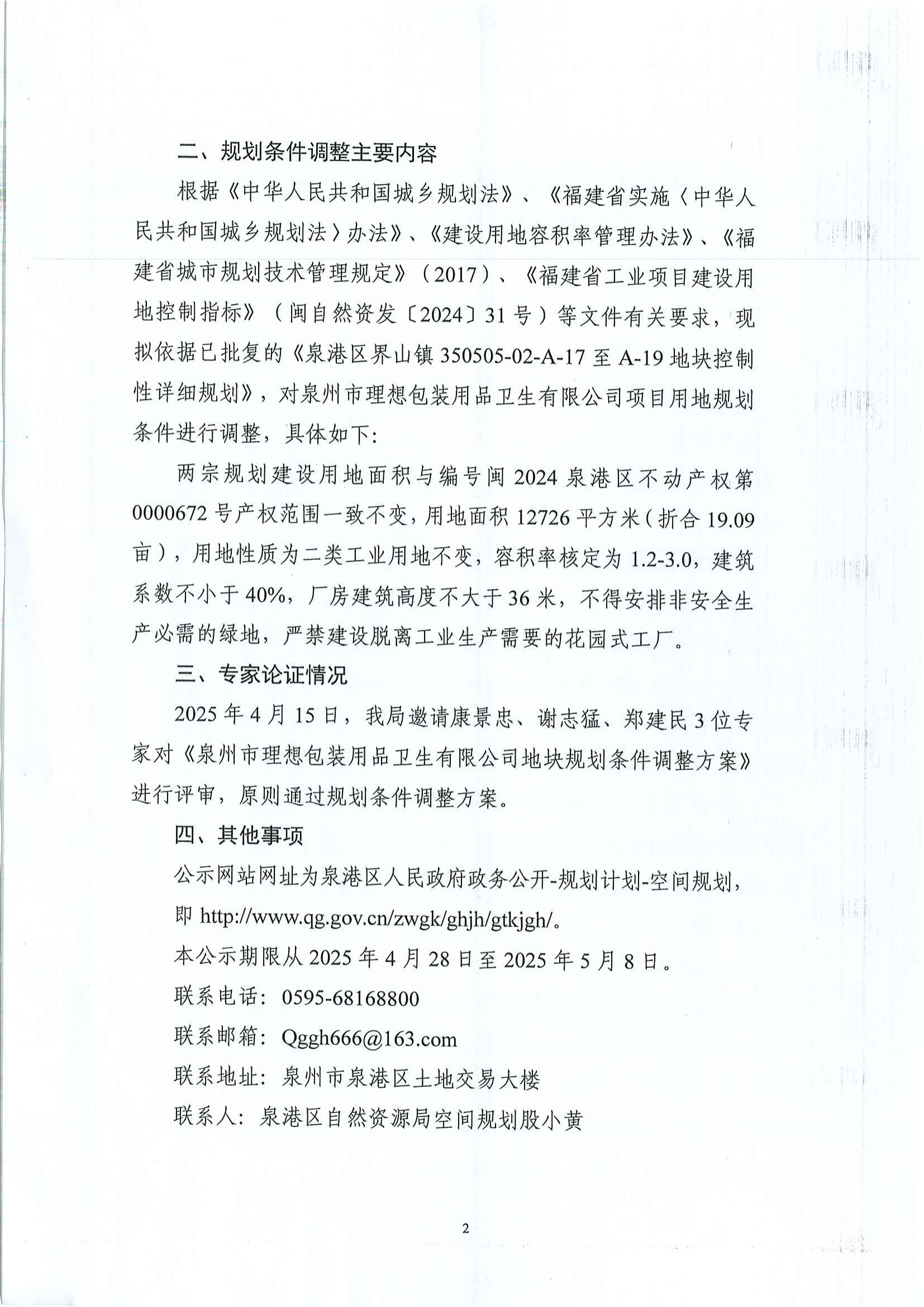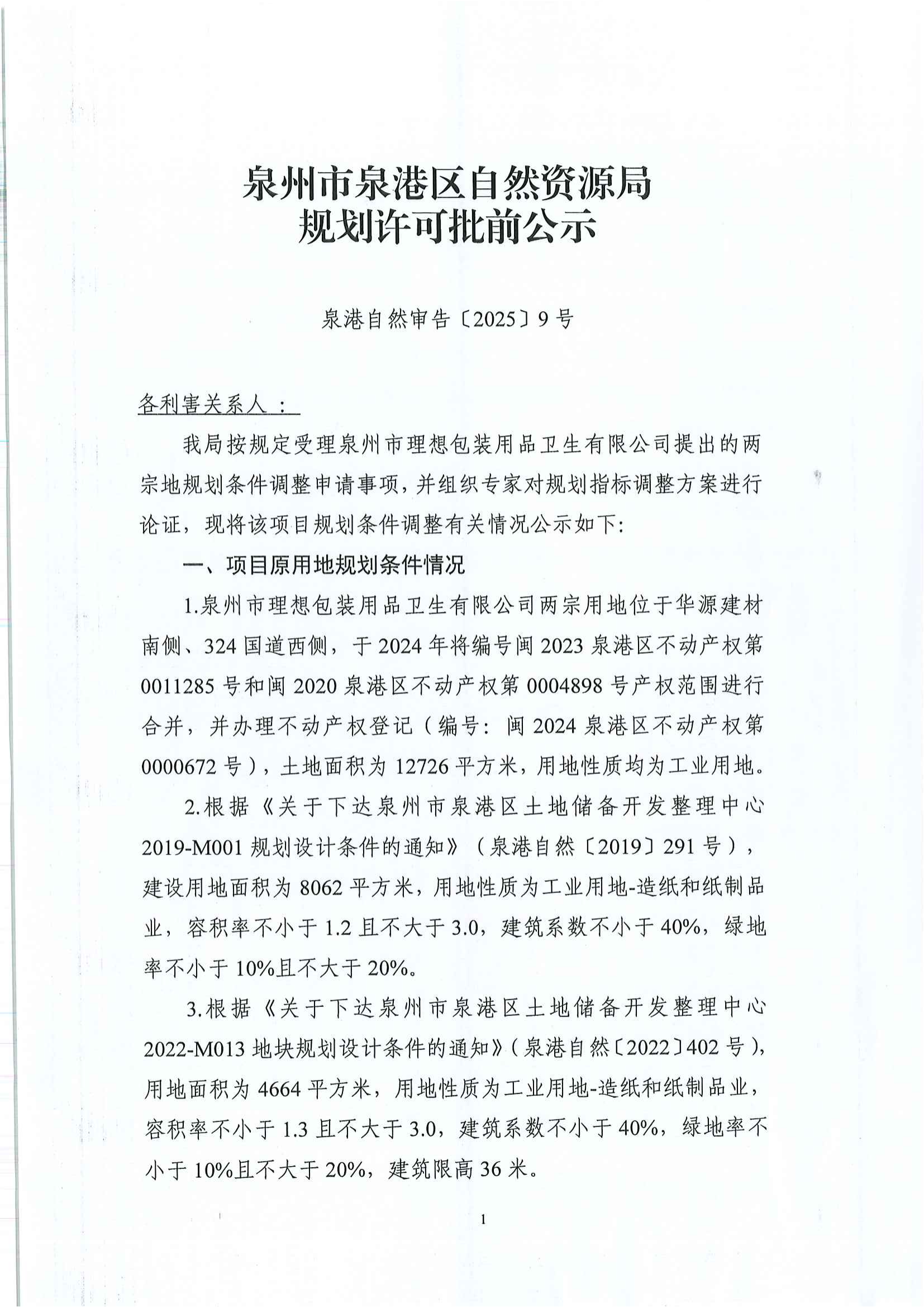 【执行公开】(国土空间规划)泉州市理想包装用品卫生有限公司项目用地规划条件调整事项公示