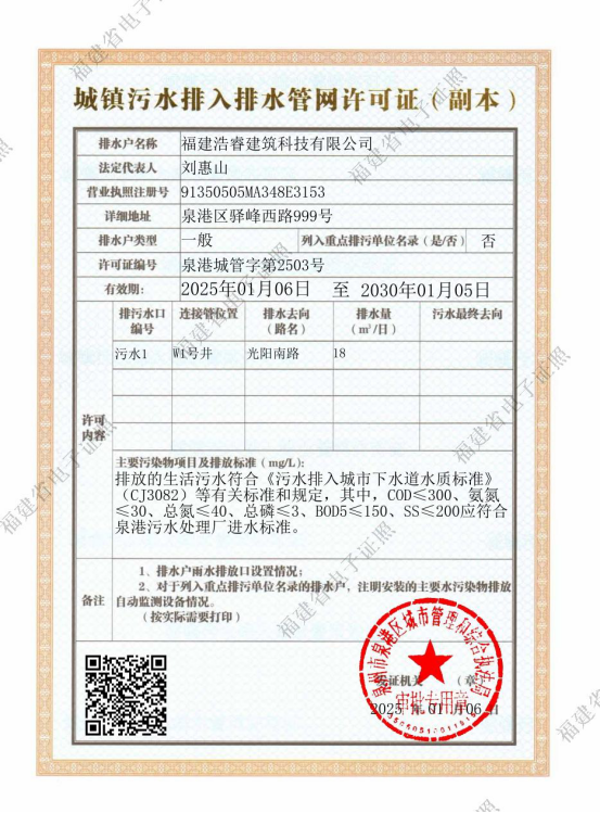 城镇污水排入排水管网许可证(泉港城管字第2503号)