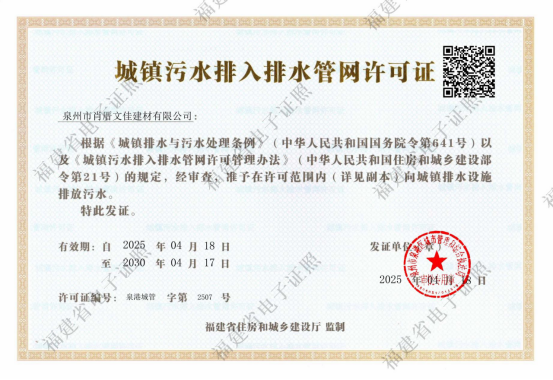 城镇污水排入排水管网许可证(泉港城管字第2507号)