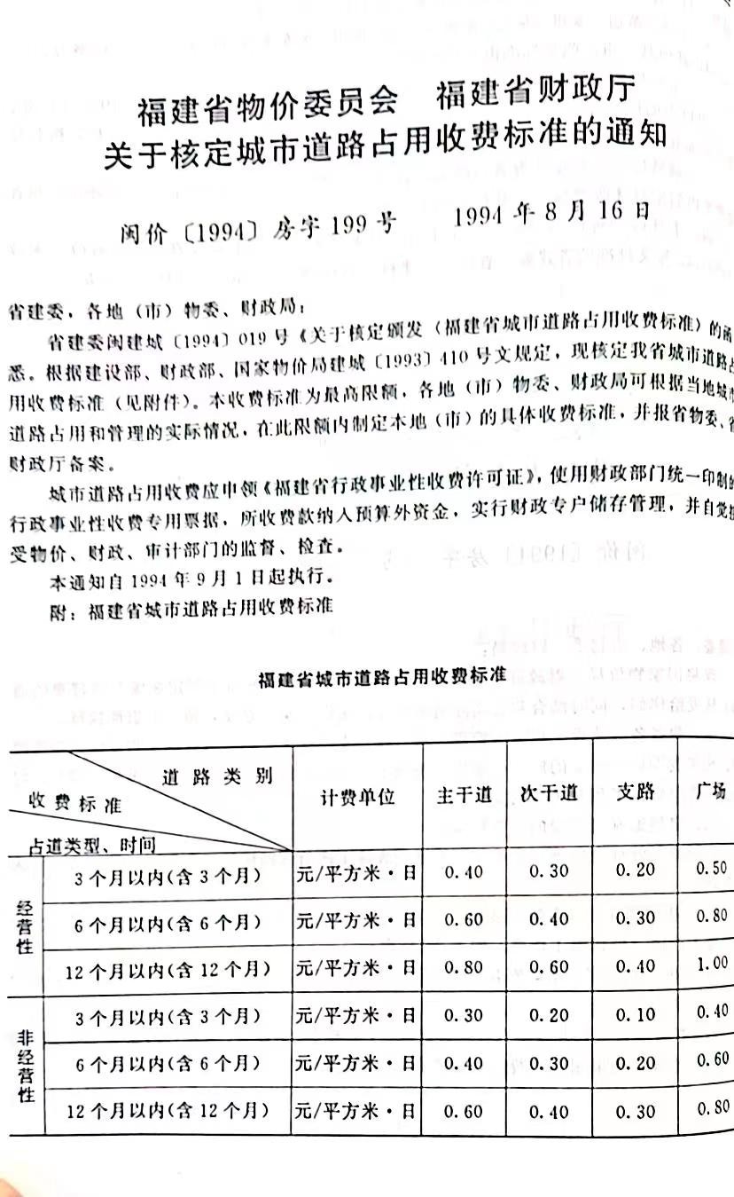 《福建省物价委员会、财政厅关于核定城市道路占用收费标准的通知》(闽价〔1994〕房字199号) |
